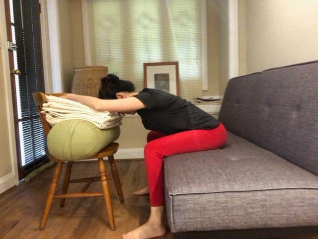 Forward Virasana, sitting on bed and with chair support for head. Take long, slow and soft exhalations.